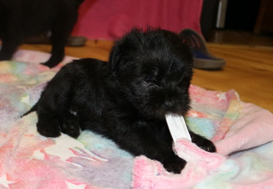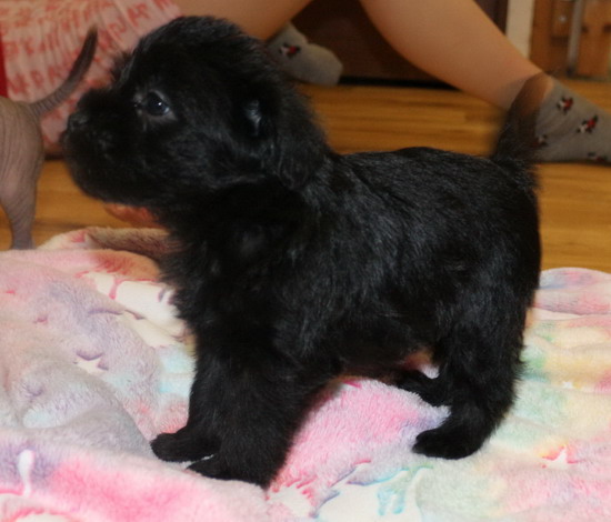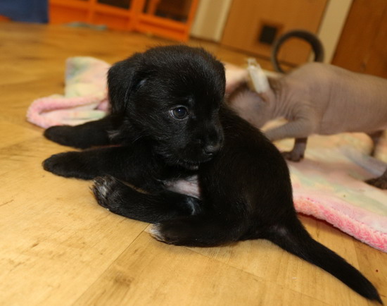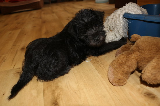 6 týdnů- běháme po bytě a zlobíme. Krademe kočkám hračky . A zjistili jsme , že naše starší ségra Rozinka je moc prima hračka. Jako jedinou ze všech psů ji naše mamina pustí k nám do ohrádky a my si s ní pak hrajeme. Brzy začneme chodit ven.