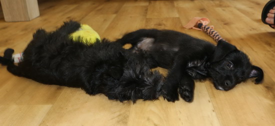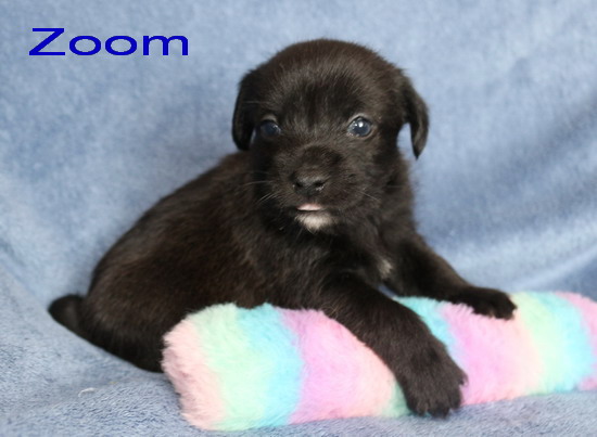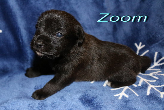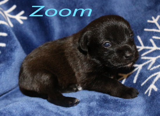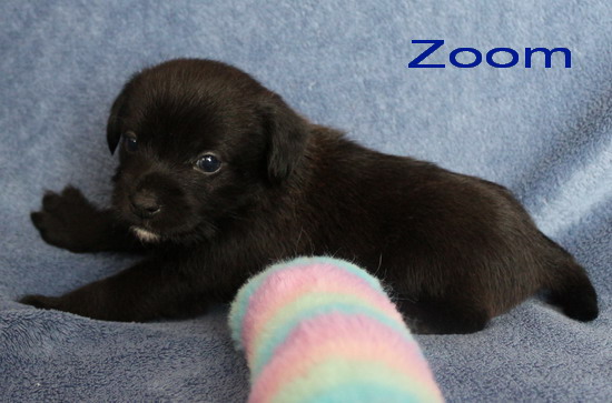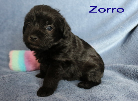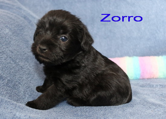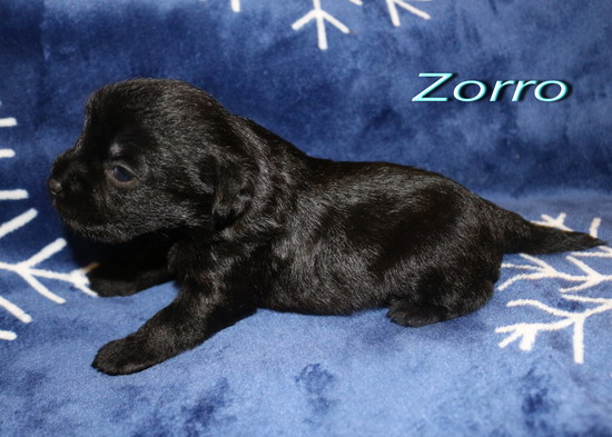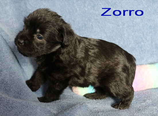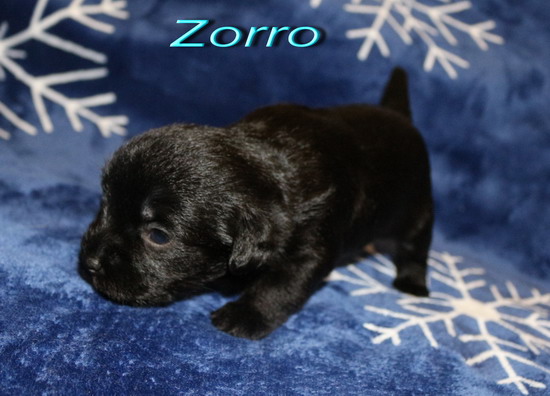 Zorro - nejmenší a nejchlupatější a štěně. Jako první si začínal hrát a nechával se drbat na bříšku. Je to takový malý rarášek , někdy ho přirovnám k plyšové hračce na líček. Hraje si , rošťačí a běhá - a pak se vypne a nabíjí baterky a spí . Bude to prima kamarád a parťák k dětem.