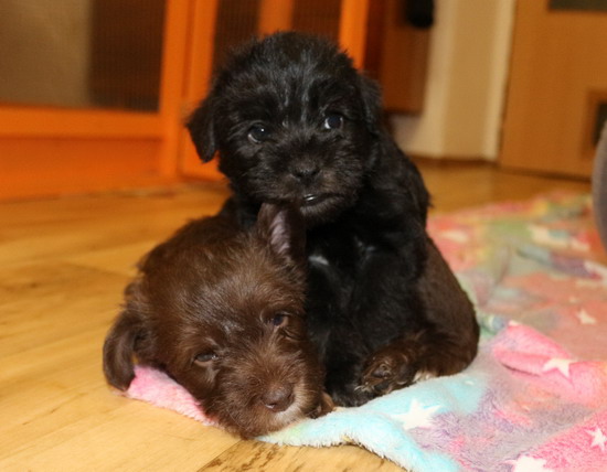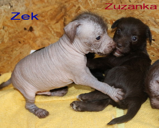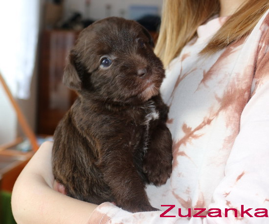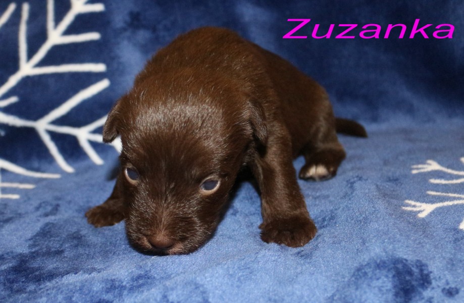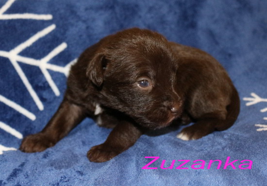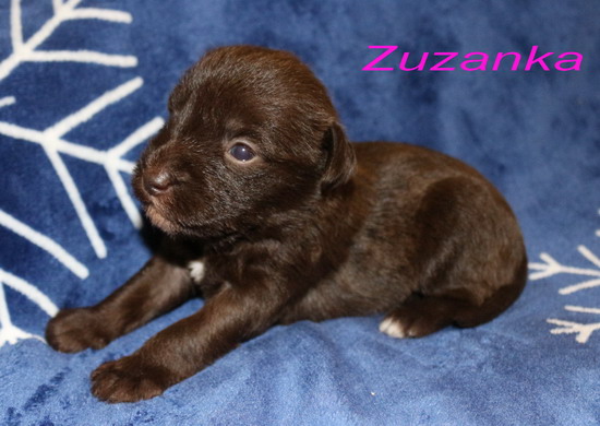 Zuzanka - Zuzanka je velmi akční štěně . První vylezla z pelíšku a v prozkoumávání je o krok napřed před ostatními. Co unese ukradne a odnese.Zlobidlo , se kterým rozhodně nikdo nudit nebude. Je to mazlínek , ňunínek , ale zároveň ďáblík . Zuzanka by potřebovala aktivní rodinu , která ji zabaví.